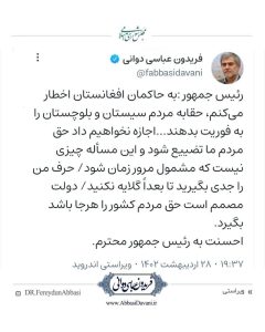 رئیس جمهور :به حاکمان افغانستان اخطار می‌کنم، حقابه مردم سیستان و بلوچستان را به فوریت بدهند…اجازه نخواهیم داد حق مردم ما تضییع شود و این مسأله چیزی نیست که مشمول مرور زمان شود/ حرف من را جدی بگیرید تا بعداً گلایه نکنید/ دولت مصمم است حق مردم کشور را هرجا باشد بگیرد.