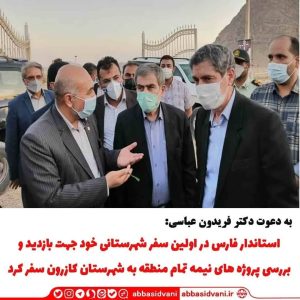 به گزارش روابط عمومی دفتر نماینده مردم شهرستان های کازرون و کوهچنار؛ طی دعوت دکتر فریدون عباسی نماینده این حوزه انتخابیه، دکتر محمد هادی ایمانیه استاندار فارس در اولین سفر حوزه ای خود جهت بازدید و بررسی از پروژه های شهرستان کازرون به این منطقه سفر کرد.