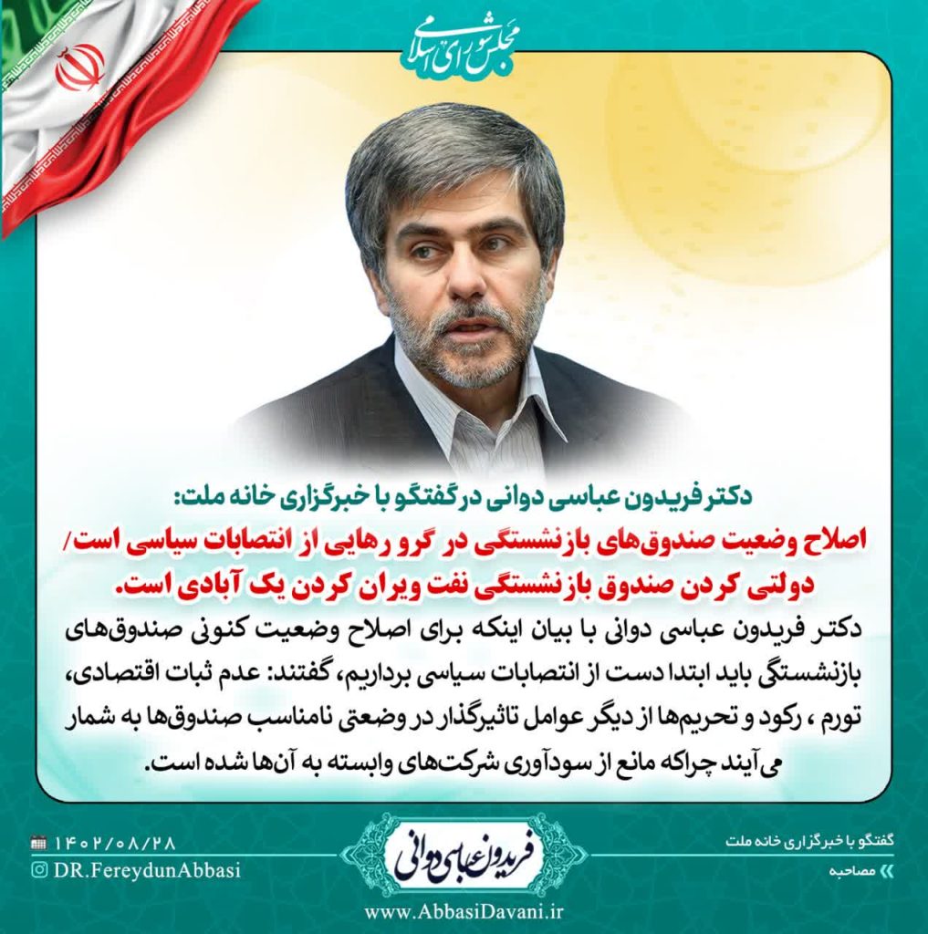 به گزارش روابط عمومی دفتر نماینده مردم شهرستان های کازرون و کوه چنار و به نقل از خبرگزاری خانه ملت؛ دکتر فریدون عباسی دوانی با انتقاد به وضعیت صندوقهای بازنشستگی و ناتوانی آنها در تامین نیازهای بازنشستگان، گفتند: صندوقها باید برای تامین نیاز بازنشستگان و پرداخت و مزایای ایام بازنشستگیشان، منابع در اختیار خود را در بخشهای مختلف اقتصادی مانند پتروشیمیها و صنایع سودآور سرمایهگذاری کنند تا صندوقها به درآمد مکفی رسیده و در ادامه به وظایف خود در مقابل بازنشستگان عمل کنند اما عدم ثبات اقتصادی، تورم، رکود و تحریمها مانع از سودآوری شرکتهای وابسته به صندوقهای بازنشستگی شده است.