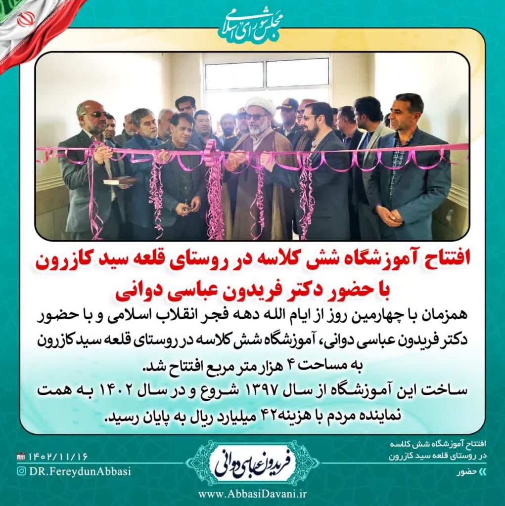 به گزارش روابط عمومی دفتر نماینده مردم شهرستان های کازرون و کوه چنار؛ همزمان با چهارمین روز از ایام الله دهه فجر انقلاب اسلامی و با حضور دکتر فریدون عباسی دوانی، آموزشگاه شش کلاسه در روستای قلعه سید کازرون به مساحت ۴ هزار متر مربع افتتاح شد.