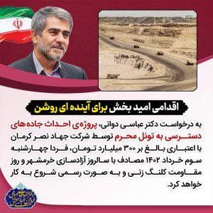 به درخواست دکتر عباسی دوانی، پروژه ی احداث جاده های دسترسی به تونل محرم توسط شرکت جهاد نصر کرمان با اعتباری بالغ بر۳۰۰ میلیارد تومان، فردا چهارشنبه سوم‌خرداد ۱۴۰۲ مصادف با سالروز آزادسازی خرمشهر و روز مقاومت با حضور دکتر خادمی ، معاون وزیر راه، کلنگ زنی و به صورت رسمی شروع به کار خواهد کرد.