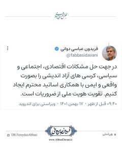 دکتر فریدون عباسی دوانی: در جهت حل مشکلات اقتصادی، اجتماعی و سیاسی، کرسی های آزاد اندیشی را بصورت واقعی و ایمن با همکاری اساتید محترم ایجاد کنیم. تقویت هویت ملی از ضروریات است.