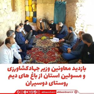 به گزارش روابط عمومی دفتر نماینده مردم شهرستان های کازرون و کوهچنار؛ به درخواست دکتر فریدون عباسی نماینده این حوزه انتخابیه *محمد مهدی برومندی معاون وزیر در امور باغبانی و مسعود منصور رئیس سازمان جنگل ها، مراتع و آبخیزداری کشور* با همراهی احمد طمراسی رئیس سازمان جهاد کشاورزی استان فارس، سید محسن قائمی مسئول حوزه نمایندگی ولی فقیه در این سازمان و عبدالحسن صمد نژاد مدیر کل منابع طبیعی و آبخیزداری استان فارس و جمعی دیگر از مدیران استان و شهرستان کازرون و کوهچنار از باغ های دیم روستای دوسیران از توابع شهرستان کوهچنار بازدید کردند.