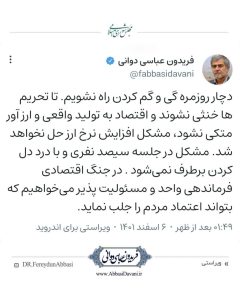 دکتر فریدون عباسی دوانی: دچار روزمره گی و گم کردن راه نشویم. تا تحریم ها خنثی نشوند و اقتصاد به تولید واقعی و ارز آور متکی نشود، مشکل افزایش نرخ ارز حل نخواهد شد. مشکل در جلسه سیصد نفری و با درد دل کردن برطرف نمیشود . در جنگ اقتصادی فرماندهی واحد و مسئولیت پذیر میخواهیم که بتواند اعتماد مردم را جلب نماید.