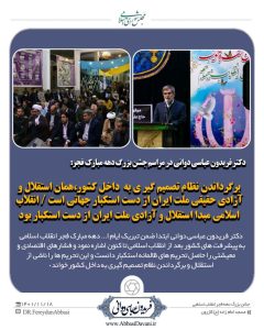 نماینده مردم کازرون و کوه چنار با اشاره به شعار انقلاب که استقلال و آزادی بود؛ برگرداندن نظام تصمیم گیری را به داخل کشور را همان استقلال و آزادی حقیقی ملت ایران از دست استکبار جهانی دانست.