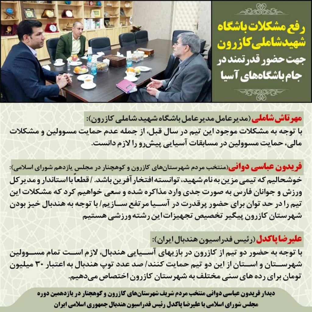 به گزارش روابط عمومی دفتر نماینده جدید مردم کازرون و کوهچنار در مجلس شورای اسلامی، فریدون عباسیدوانی نماینده مردم شهرستانهای کازرون و کوه چنار در مجلس شورای اسلامی با حضور در فدراسیون هندبال در جلسهای با علیرضا پاکدل رئیس کازرونی این فدراسیون در خصوص رفع مشکلات باشگاه شهید شاملی کازرون جهت حضور پرقدرت در باشگاههای آسیا و تجهیز ورزش هندبال حوزه انتخابیه به بحث و تبادل نظر پرداخت.