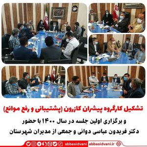 به گزارش روابط عمومی دفتر نماینده شهرستان‌های کازرون و کوه‌چنار، در چارچوب راهبرد جهاد خدمت دکتر فریدون عباسی دوانی نماینده شهرستان‌های کازرون و کوه‌چنار و در راستای تحقق منویات مقام معظم رهبری با تدبیر دکتر عباسی دوانی، کارگروه پشتیبانی و رفع موانع در شهرستان کازرون تحت عنوان “کارگروه پیشروان کازرون” در شهرستان کازرون تشکیل و اولین جلسه این کار گروه در تاریخ ۱۲ فروردین ماه همزمان با روز جمهوری اسلامی ایران برگزار گردید.