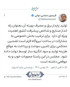دکتر فریدون عباسی دوانی: تولید پایدار برق و مصرف بهینه آن بعنوان راه انداز صنایع و شاخص پیشرفت کشور اهمیت ویژه ای دارد. برای ترغیب بخش خصوصی به مشارکت در ساخت نیروگاه لازم است تضمین محکمی برای تامین سوخت و پرداخت به موقع هزینه تولید و سود انگیزه ساز توسط دولت داده شود. مجلس در این راستا مصوبات خوب و به موقعی داشته است.