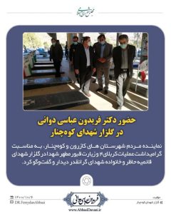 به گزارش روابط عمومی دفتر نماینده مردم شهرستان های کازرون و کوه چنار: دکتر فریدون عباسی دوانی نماینده مردم این حوزه انتخابیه، به مناسبت گرامیداشت عملیات کربلای ۴ و زیارت قبور مطهر شهدا در گلزار شهدای شهرستان کوه چنار (شهر قائمیه) حاضر و با خانواده این شهدای گرانقدر دیدار و گفتگو کرد.
