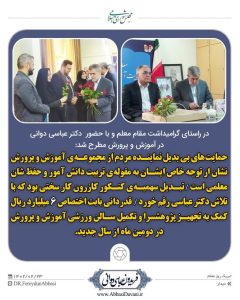 امیرحسین جمشیدی، معاون مدیرکل و مدیر آموزش و پرورش کازرون در این دیدار ضمن تقدیر از حضور مستقیم دکتر فریدون عباسی و مسئولان همراه در مجموعه آموزش و پرورش این شهر گفت: پیگیری مطالبات آموزش و پرورش کازرون اعم از تغییر سهمیه کازرون از منطقه دو به سه ، تخصیص اعتبار مالی جهت نوسازی و تجهیز تنها سالن ورزشی فرهنگیان، تامین منابع مالی جهت تجهیزات و امکانات مدارس و … توسط نماینده مردم شهرستان های کازرون و کوه چنار، نشان از حسن توجه، همکاری و تعامل خوب نماینده مردمی کازرون با مجموعه آموزش و پرورش این شهر دارد.