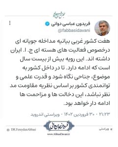 دکتر فریدون عباسی دوانی: هفت کشور غربی بیانیه مداخله جویانه ای درخصوص فعالیت های هسته ای ج. ا. ایران داشته اند. این رویه بیش از بیست سال است که ادامه دارد. تا در داخل کشور به موضوع، جناحی نگاه شود و قدرت علمی و توانمندی کشور بر اساس نظریه مقاومت مد نظر نباشد، این دخالت ها و مزاحمت ها ادامه دار خواهد بود.