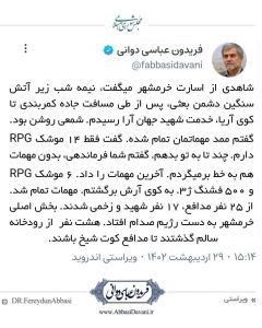دکتر فریدون عباسی دوانی: شاهدی از اسارت خرمشهر میگفت، نیمه شب زیر آتش سنگین دشمن بعثی، پس از طی مسافت جاده کمربندی تا کوی آریا، خدمت شهید جهان آرا رسیدم. شمعی روشن بود. گفتم ممد مهماتمان تمام شده. گفت فقط ۱۴ موشک RPG دارم. چند تا به تو بدهم. گفتم شما فرماندهی، بدون مهمات هم به خط برمیگردم. آخرین مهمات را داد. ۶ موشک RPG و ۵۰۰ فشنگ ژ۳. به کوی آرش برگشتم. مهمات تمام شد. از ۲۵ نفر مدافع، ۱۷ نفر شهید و زخمی شدند. بخش اصلی خرمشهر به دست رژیم صدام افتاد. هشت نفر از رودخانه سالم گذشتند تا مدافع کوت شیخ باشند.