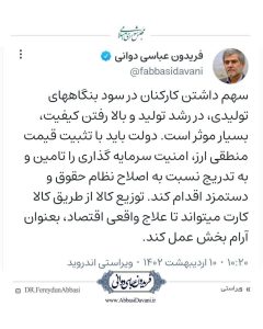 سهم داشتن کارکنان در سود بنگاههای تولیدی، در رشد تولید و بالا رفتن کیفیت، بسیار موثر است. دولت باید با تثبیت قیمت منطقی ارز، امنیت سرمایه گذاری را تامین و به تدریج نسبت به اصلاح نظام حقوق و دستمزد اقدام کند. توزیع کالا از طریق کالا کارت میتواند تا علاج واقعی اقتصاد، بعنوان آرام بخش عمل کند.