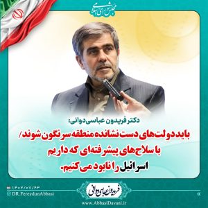 به گزارش روابط عمومی دفتر نماینده مردم شهرستان های کازرون و کوه چنار و به نقل از خبرگزاری مجلس شورای اسلامی؛دکتر فریدون عباسی، عضو کمیسیون انرژی مجلس در گفتگو با خبرگزاری مجلس شورای اسلامی گفتند: بهترین راه نابودی اسرائیل سرنگونی دولتهای دست نشانده منطقه است.