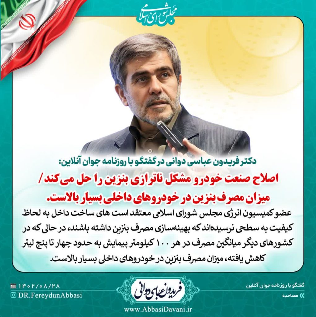 به گزارش روابط عمومی دفتر نماینده مردم شهرستان های کازرون و کوه چنار و به نقل از‌ روزنامه جوان آنلاین؛ دکتر فریدون عباسی دوانی  عضو کمیسیون انرژی مجلس معتقد است خودرو‌های ساخت داخل به لحاظ کیفیت به سطحی نرسیده‌اند که بهینه‌سازی مصرف بنزین داشته باشند، در حالی که در کشور‌های دیگر میانگین مصرف در هر ۱۰۰ کیلومتر پیمایش به حدود چهار تا پنج لیتر کاهش یافته، میزان مصرف بنزین در خودرو‌های داخلی بسیار بالاست. خودرو‌های فرسوده و از‌رده‌خارج‌نشده را هم باید به لیست عواملی که در بروز ناترازی بنزین در کشور اثرگذار بوده‌اند، اضافه کنیم، این خودرو‌ها مشکلات زیادی برای‌مان ایجاد کرده‌اند، از جمله اینکه آلایندگی بالایی دارند و بنزین زیادی هم مصرف می‌کنند.