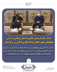 به گزارش روابط عمومی دفتر نماینده مردم شهرستان های کازرون و کوه چنار؛ دکتر فریدون عباسی دوانی نماینده این حوزه انتخابیه با خانم میرلا کارمن گرکو سفیر کشور رومانی در ایران پیرامون مسائل گردشگری و اقتصادی استان فارس و منطقه کازرون و کوه چنار دیدار و گفتگو کرد.