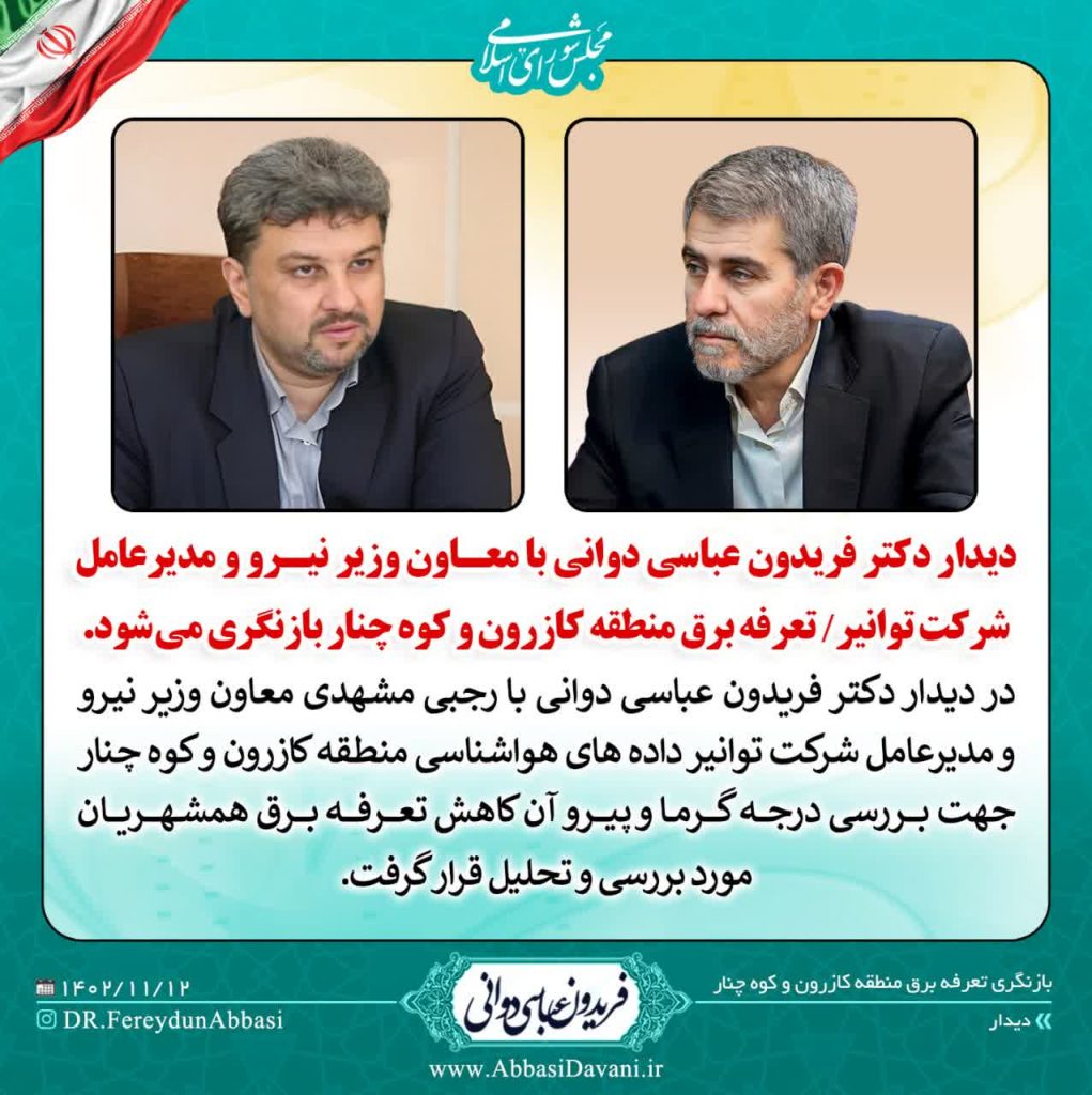 به گزارش روابط عمومی دفتر نماینده مردم شهرستان های کازرون و کوه چنار؛ در دیدار دکتر فریدون عباسی دوانی با رجبی مشهدی معاون وزیر نیرو و مدیرعامل شرکت توانیر داده های هواشناسی منطقه کازرون و کوه چنار جهت بررسی درجه گرما و پیرو آن کاهش تعرفه برق همشهریان مورد بررسی و تحلیل قرار گرفت.