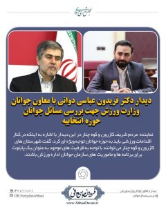 دکتر فریدون عباسی دوانی از معاونت امور جوانان وزارت ورزش خواست تا شوراهایی که در حوزه مسائل جوانان فعالیت میکنند و صاحب هستند به صورت مشترک با فرمانداریها اجماع داشته و جهت اجرای طرحهای مورد نظر معاونت جوانان وزارت ورزش و جوانان اقدام نمایند.