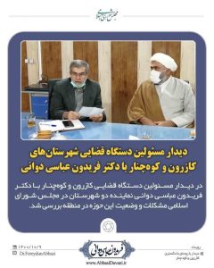 به درخواست مسولین قضایی شهرستان کازرون و کوه چنار مطالبات کارمندان، قضات‌ و دیگر مسائل مرتبط با حوزه دستگاه قضایی دو شهرستان و انتقال مشکلات و کمبود ها به مراجع بالادستی در دستور کار دکتر عباسی قرار گرفت.