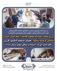 دکتر فریدون عباسی با اشاره به اینکه دروزاه ی انتقال گلایه های مردم از وضعیت خدمت رسانی در حوزه ی درمان بنده میباشم افزودند : روزی نیست که به خاطر مشکلات بیمارستان با من تماس گرفته نشود که با پاسخگویی سریع رئیس محترم نسبت به حل آن اقدام خواهد شد و دائما مردم را به صبوری و سعه ی صدر در مواجه با کاستی ها توصیه میکنم و مشکلات پیش روی مسئولین را شرح میدهم .