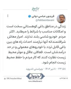 دکتر فریدون عباسی دوانی: زندگی در مناطق باغی کوهستانی سخت است و امکانات مناسب با شرائط را میطلبد. اکثر مردم خودرو شاسی بلند ندارند. امرار معاش شرافتمندانه آنها نیازمند احداث راه های بین باغی قابل تردد با خودروهای معمولی و در حد درآمدشان است. فعالان عاقل و موثر محیط زیست نظارت کنند که کار مردم با حفظ محیط زیست انجام شود.