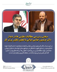 به گزارش روابط عمومی دفتر ارتباطات مردمی نماینده مردم شریف شهرستان های کازرون و کوه چنار، دکتر فریدون عباسی دوانی با اهتمام به اشتغالزایی در منطقه و پیگیری وضعیت تعاونی ها و مطالبات این قشر زحمتکش با مهندس مسکنی معاون تعاون وزیر کار دیدار و گفتگو کردند.