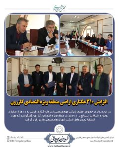 در این دیدار با توجه به اهمیت ورود صنایع بزرگ به منطقه و کمبود اراضی مد نظر قرارگرفته شده در گذشته برای منطقه ویژه اقتصادی کازرون، در خصوص افزایش اراضی منطقه ویژه اقتصادی کازرون در سه فاز که شامل ۷۵ هکتار فاز اول، ۱۲۵ فاز دوم و ۱۱۰ هکتار در فاز سوم گفتگو و موافقت شد.
