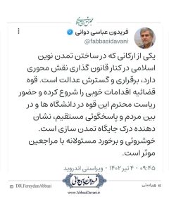 دکتر فریدون عباسی دوانی: یکی از ارکانی که در ساختن تمدن نوین اسلامی در کنار قانون گذاری نقش محوری دارد، برقراری و گسترش عدالت است. قوه قضائیه اقدامات خوبی را شروع کرده و حضور ریاست محترم این قوه در دانشگاه ها و در بین مردم و پاسخگوئی مستقیم، نشان دهنده درک جایگاه تمدن سازی است. خوشروئی و برخورد مسئولانه با مراجعین موثر است.