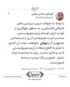 دکتر فریدون عباسی دوانی: با توجه به تحولات درون سرزمین های اشغالی فلسطین، به منظور جلوگیری از تهدید ایران توسط رژیم صهیونیستی، مناسب است هموطنان آذری از مسلمانان جمهوری آذربایجان بخواهند دولت آن کشور را ملزم به قطع رابطه با رژیم صهیونیستی کنند و تاکید نمایند برای ما مزاحمت ایجاد نشود. حضور پر رنگ مردم در صحنه ضروریست.