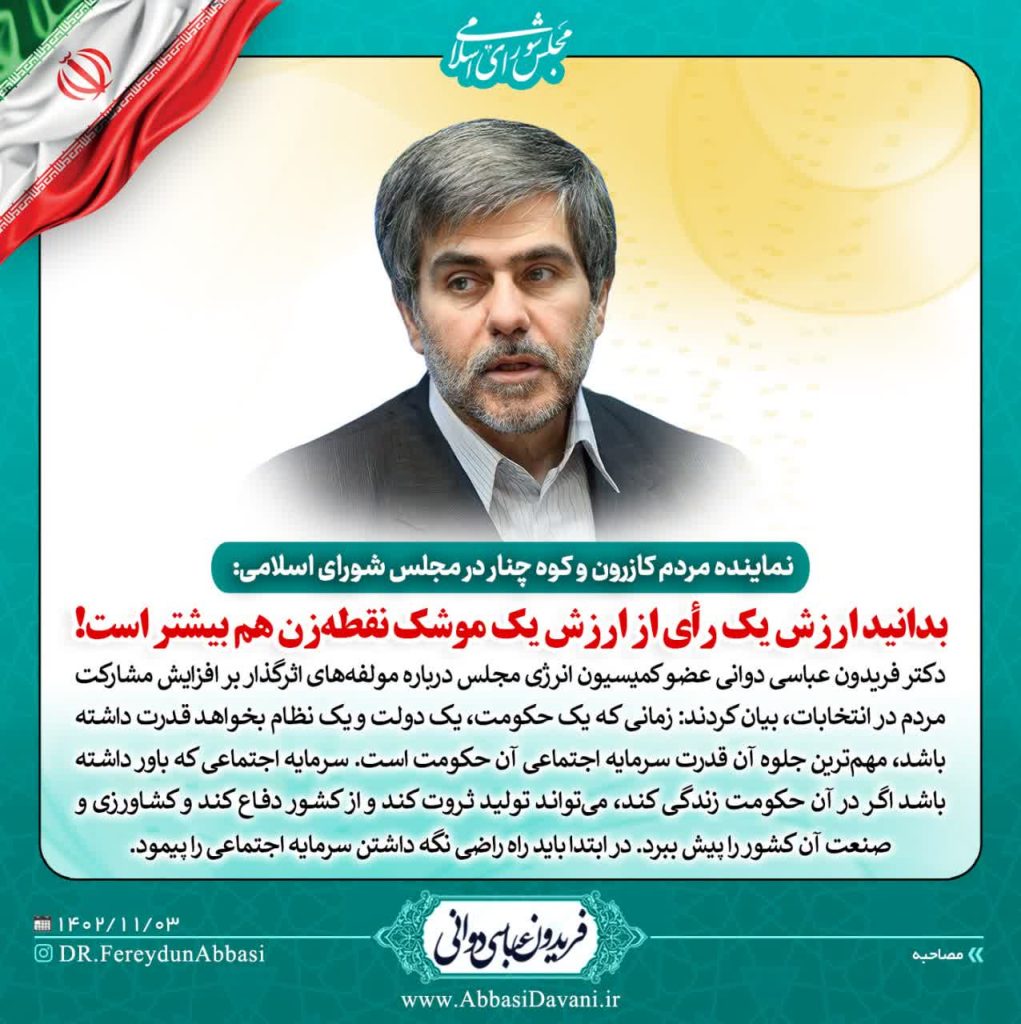 نماینده مردم کازرون و کوه چنار در مجلس شورای اسلامی: بدانید ارزش یک رأی از ارزش یک موشک نقطه‌زن هم بیشتر است!