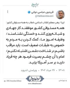 رهبر معظم انقلاب اسلامی خطاب به همه مسئولان کشور: همه مسئولان کشور موظف اند کار جهادی و شبانه روزی کنند و خستگی نشناسند/ وظیفه امروز ما ، کمک کردن به مردم به خصوص به طبقات ضعیف است. باید مراقب باشیم در شناخت دشمن اشتباه نکنیم / امام (ره) با آن چشم بصیرت فرمود هر چه فریاد دارید بر سر آمریکا بزنید.