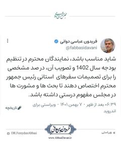دکتر فریدون عباسی دوانی: شاید مناسب باشد، نمایندگان محترم در تنظیم بودجه سال ۱۴۰۲ و تصویب آن، در صد مشخصی را برای تصمیمات سفرهای استانی رئیس جمهور محترم اختصاص دهند تا بحث ها و مشورت ها در مجلس مفهوم درستی داشته باشد.