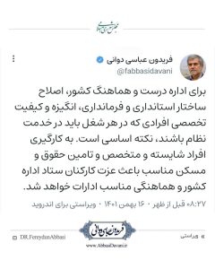 دکتر فریدون عباسی دوانی: برای اداره درست و هماهنگ کشور، اصلاح ساختار استانداری و فرمانداری، انگیزه و کیفیت تخصصی افرادی که در هر شغل باید در خدمت نظام باشند، نکته اساسی است. به کارگیری افراد شایسته و متخصص و تامین حقوق و مسکن مناسب باعث عزت کارکنان ستاد اداره کشور و هماهنگی مناسب ادارات خواهد شد.