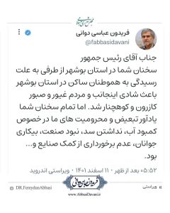 سخنان شما در استان بوشهر از طرفی به علت رسیدگی به هموطنان ساکن در استان بوشهر باعث شادی اینجانب و مردم غیور و صبور کازرون و کوهچنار شد. اما تمام سخنان شما یادآور تبعیض و محرومیت های ما در خصوص کمبود آب، نداشتن سد، نبود صنعت، بیکاری جوانان، عدم برخورداری از کمک صنایع و… بود.