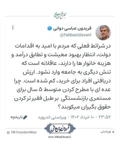دکتر فریدون عباسی دوانی: در شرائط فعلی که مردم با امید به اقدامات دولت، انتظار بهبود معیشت و تطابق درآمد و هزینه خانوار ها را دارند، عاقلانه است که تنش دیگری به جامعه وارد نشود. ارزش دریافتی افراد برای خرید، کم شده است. چرا عده ای با مطرح کردن متوسط ۵ سال برای مستمری بازنشستگی بر طبل فقیر تر کردن حقوق بگیران میکوبند؟