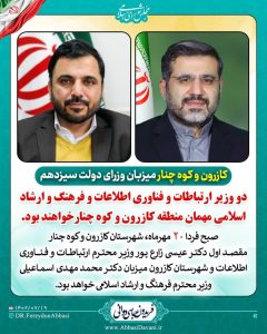 طبق برنامه های صورت گرفته صبح فردا ۲۰ مهرماه شهرستان کازرون و کوه چنار مقصد اول دکتر عیسی زارع پور وزیر محترم ارتباطات و فناوری اطلاعات و شهرستان کازرون میزبان دکتر محمد مهدی اسماعیلی وزیر محترم فرهنگ و ارشاد اسلامی خواهد بود.